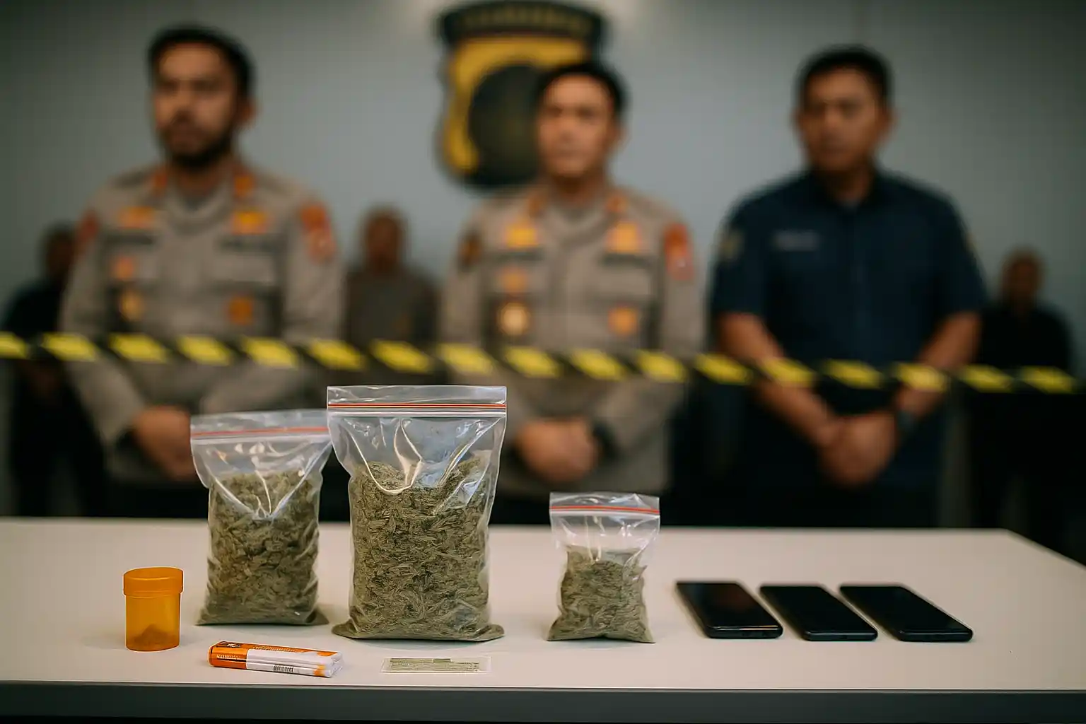 Pemberitaan menyebut polisi mengamankan sejumlah benda, antara lain plastik klip berisi batang ganja, boks kecil bekas ekstasi, papir atau alat linting, serta beberapa ponsel untuk ditelusuri percakapan dan transaksi. Semua temuan itu masih diuji laboratorium. Apabila terkonfirmasi, penyidik akan menentukan konstruksi perkara: pemakaian pribadi, kepemilikan, atau dugaan peredaran. Di saat yang sama, tersangka berhak didampingi penasihat hukum, menjalani pemeriksaan sesuai KUHAP, dan mendapatkan akses kesehatan bila dibutuhkan. Aspek ini penting agar proses adil dan bisa diaudit.